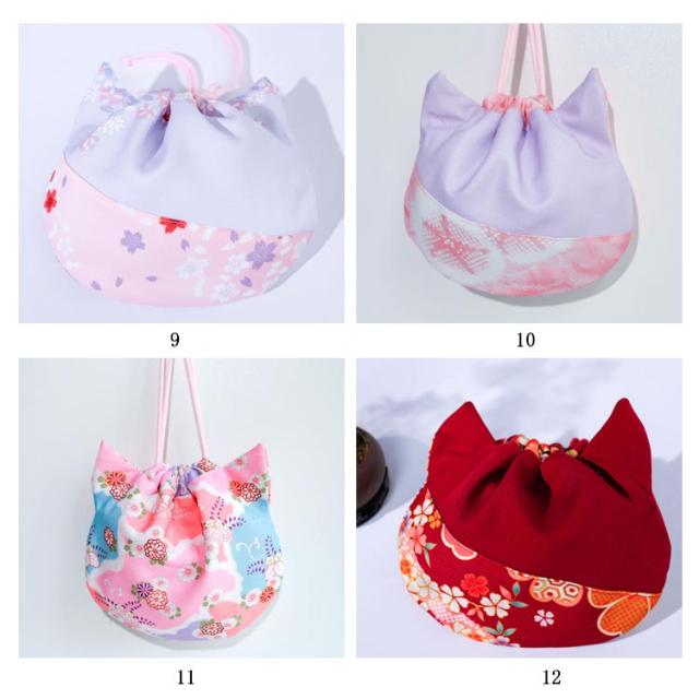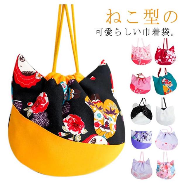 | ねこ型の可愛らしい巾着袋。 キュット紐を締めるだけで可愛いネコちゃんに変身。見ているだけで癒される。 着物姿や浴衣姿にぴったりの和柄の巾着バッグ、七五三、卒園式、お正月、お宮参りなどイベントやフォーマルシーンに大活躍。 | |
