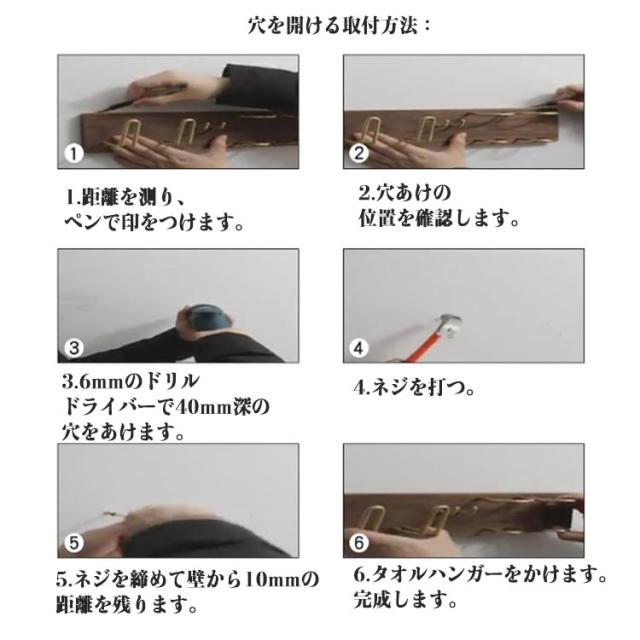 | タオル掛けハンガー。タオルホルダーとしてはもちろん、トイレのインテリアも楽しめます。 真鍮×木目のシンプルデザインヴィンテージ風の質感を表現しました。 耐衝撃性や高い剛性を持ち、錆びることがなく、色落ちの心配も要らなく、長期に使用できます。 美しい木目とファション感溢れる真鍮棒の組み合わせ。 トイレ、ベッドルーム、浴室、ホテルレストラン、バー、公衆トイレな どに適合します。ワンポイントで上質な空間に早変わりします。 穴あけ不要取付方法: 1.取付位置を確認し、壁を清潔にする。 2.のりを塗る。 3.壁に貼り付けて、力を入れて、押します。 4.補助テープで48時間固定すれば正常に使用できる。 穴を開ける取付方法: 1.距離を測り、ペンで印をつけます。 2.穴あけの位置を確認します。 3.6mmのドリルドライバーで40mm深の穴をあけます。 4.ネジを打つ。 5.ネジを締めて壁から10mmの距離を残ります。 6.タオルハンガーをかけます。完成します。 | |