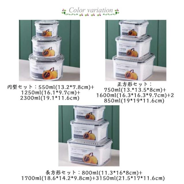 | サイズについての説明 | サイズ:円型セット:550ml(13.2*7.8cm)+1250ml(16.1*9.7cm)+2300ml(19.1*11.6cm) 長方形セット:800ml(11.3*16*8cm)+1700ml(18.6*14.2*9.8cm)+3150ml(21.5*17*11.6cm) 正方形セット:750ml(13.*13.5*8cm)+1600ml(16.3*16.3*9.7cm)+2850ml(19*19*11.6cm) ※測定方法によって誤差が生じますので、予めご了承下さい。 |