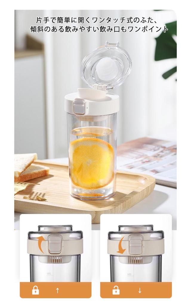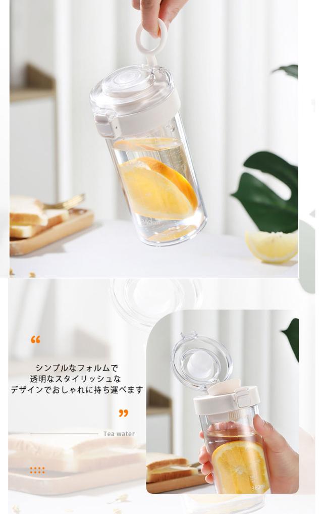 | お茶やお湯の沸かしたてをそのまま注ぐことができ、便利に使えるウォーターボトル。 片手で簡単に開くワンタッチ式のふた、傾斜のある飲みやすい飲み口もワンポイント。 安全、非毒性、耐久性この飛散防止、軽量、再利用可能なウォーターボトルは、有害な化学物質、プラスチックの味、悪臭のない水をリラックスして楽しむことができます! シンプルなフォルムで透明なスタイリッシュなデザインでおしゃれに持ち運べます。 食品グレードPP素材の茶こし付き、茶葉やコーヒー、果物、アイスなどを入れて、楽しく飲むことができます。 茶こしやフタなど各パーツは分解して洗えるからいつも清潔にご利用いただけます。 | |