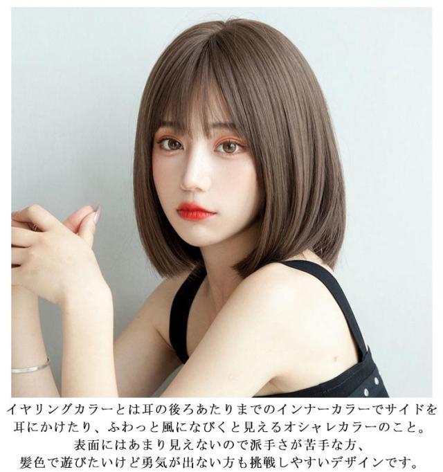| キュートなショットボブ! 小顔効果抜群のヘアスタイルで、エアリー感たっぷり。 くし通りが良く人毛に近い高品質な耐熱ファイバーを採用。サラサラなヘアスタイルを維持します。 自然な分け目に見える人工頭皮で、まるで地毛のような自然な見た目を実現しました。 イヤリングカラーとは耳の後ろあたりまでのインナーカラーでサイドを耳にかけたり、ふわっと風になびくと見えるオシャレカラーのこと。表面にはあまり見えないので派手さが苦手な方、髪色で遊びたいけど勇気が出ない方も挑戦しやすいデザインです。 通気性が良く快適にご着用いただけるメッシュネットを採用したウィッグ。長時間のご使用もストレスフリーでお過ごしいただけます。 | |