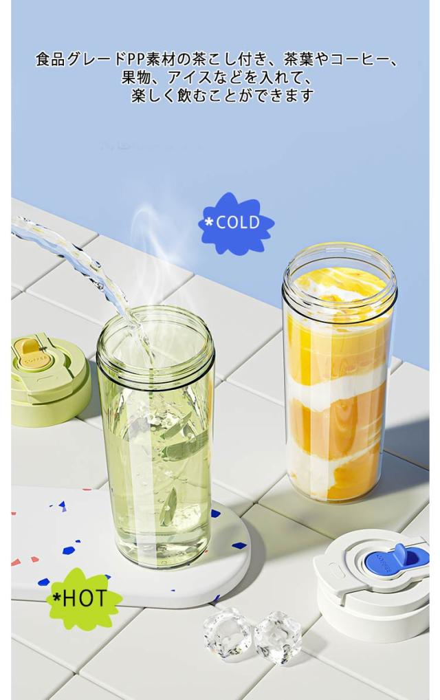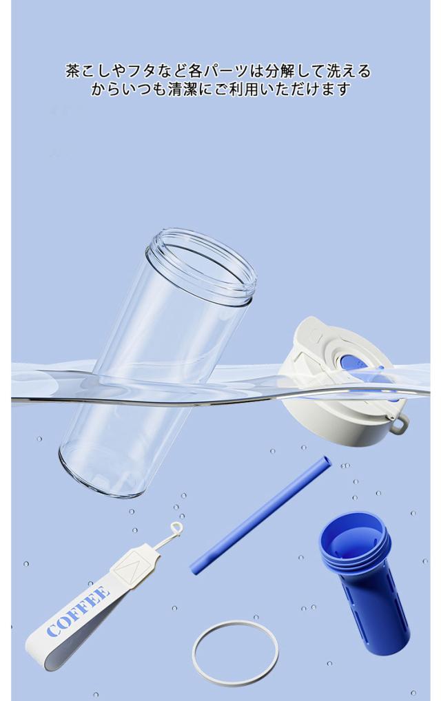 | お茶やお湯の沸かしたてをそのまま注ぐことができ、便利に使えるウォーターボトル。 片手で簡単に開くワンタッチ式のふた、傾斜のある飲みやすい飲み口もワンポイント。 安全、非毒性、耐久性この飛散防止、軽量、再利用可能なウォーターボトルは、100%BPAフリーのプラスチックで作られています。有害な化学物質、プラスチックの味、悪臭のない水をリラックスして楽しむことができます! シンプルなフォルムで透明なスタイリッシュなデザインでおしゃれに持ち運べます。 食品グレードPP素材の茶こし付き、茶葉やコーヒー、果物、アイスなどを入れて、楽しく飲むことができます。 茶こしやフタなど各パーツは分解して洗えるからいつも清潔にご利用いただけます。 | |