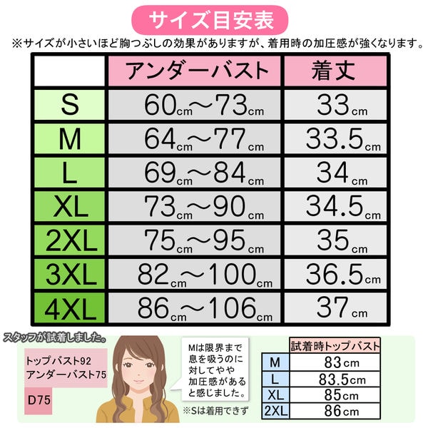 ※小さいサイズほど胸つぶしの効果が高くなりますが、着用時の加圧感が強くなります。