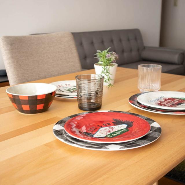 森やロッジの絵柄をモチーフとした質感のあるメラミン食器です