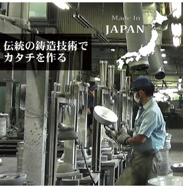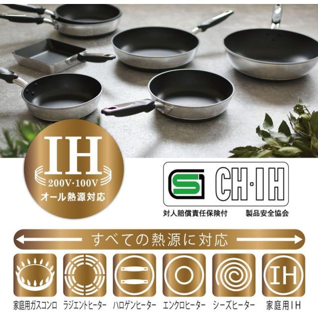 【材質】本体/アルミニウム合金、内面/ テフロンTMプラチナ加工、外面/ミラー仕上げ・セラミック耐熱塗装(底)、底面/ 鉄・アルミニウム溶射・はり底、取っ手/フェノール樹脂