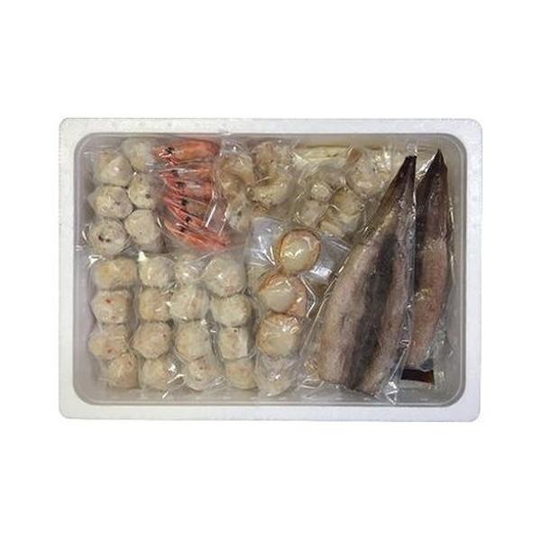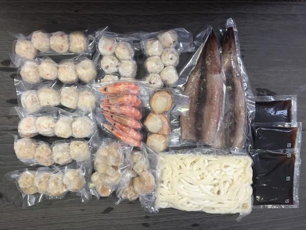 かに入つみれ×8個、えび入つみれ×8個、とりごぼうつみれ×8個、たこ入つみれ×12個、ボイル海老×6尾、ボイル帆立×3個、ボイルつぶ60g×2袋、ツボ抜きいか100g×2尾、冷凍うどん250g×1玉、たれ(濃縮:醤油仕立て)50ml×3袋