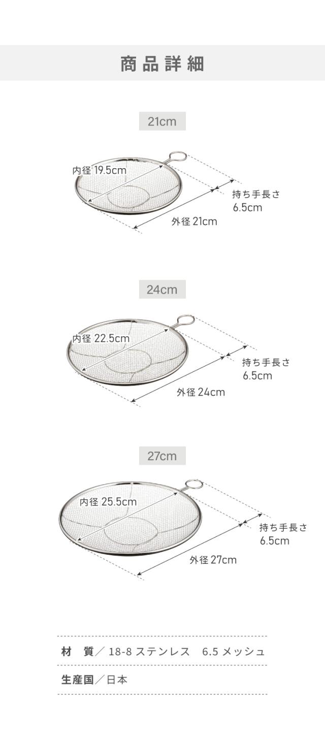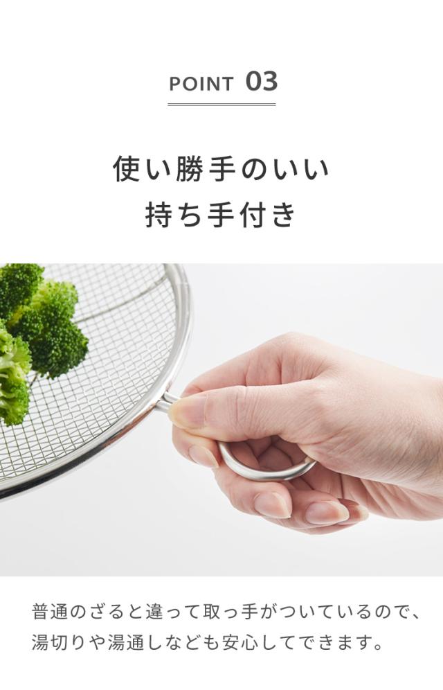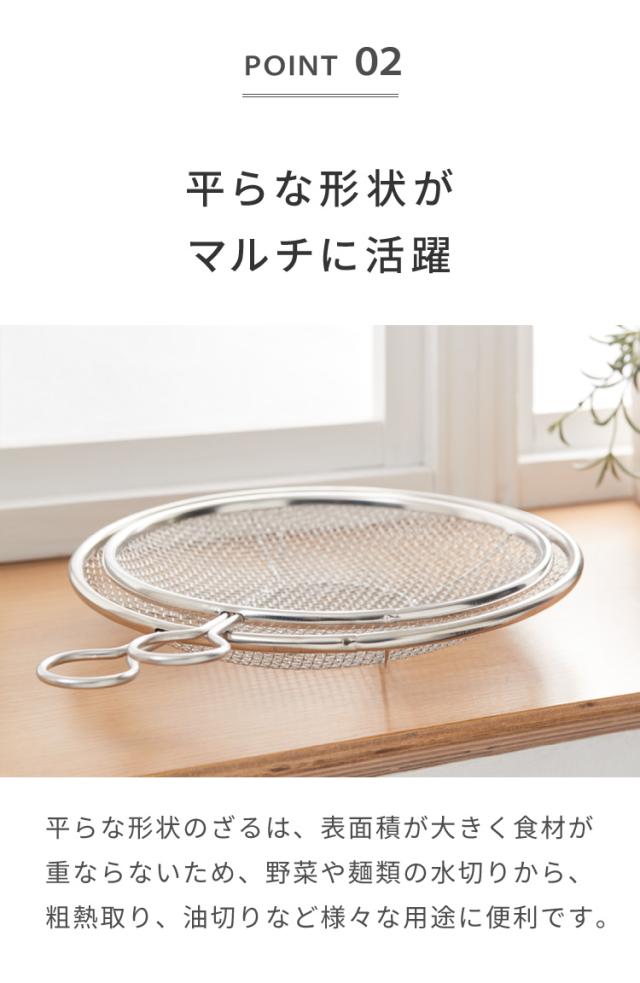 粗熱取り、湯通し、油取り、水切りなど様々なシーンで活躍する盆ザルです。
