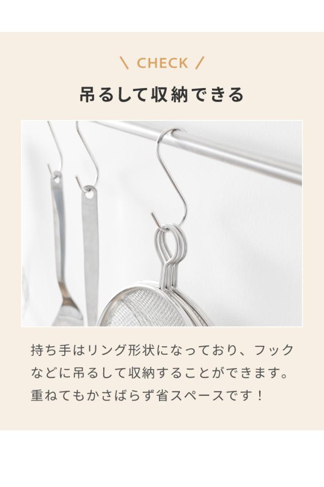 持ち手のリングに引っ掛けて吊るす収納や、重ねてかさばらずに収納することができます。