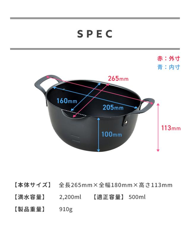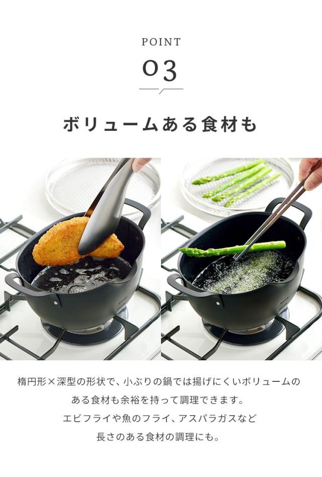 ボリュームのあるカツやエビ、魚のフライ等も余裕をもって調理でき、使用後はコンパクトに収納できる小判型ボディです。