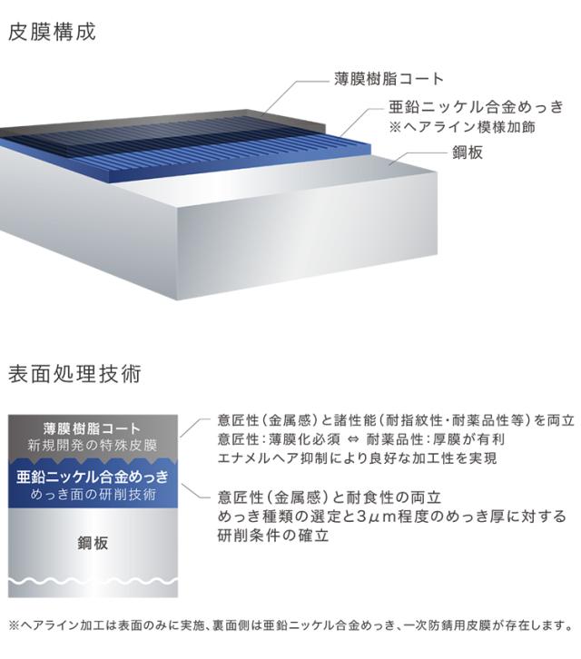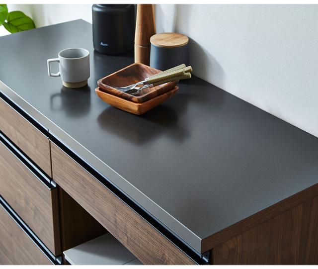 〇カウンタートップには日本製鉄製の“フェルーチェ”という鋼板を使用、指紋が付きにくく耐水性や耐熱性に優れています。
