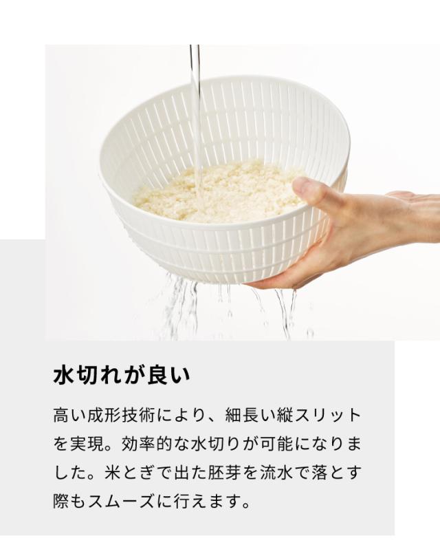 日本で古くから使われている「マタタビのザル」の弾力性と水切れを樹脂製品で再現したザルとボウルのセットです。お米をふっくらとみずみずしく炊き上げるための「とぎ方」にこだわり、ザルは柔軟性のある新素材を採用。米粒が割れにくく、米とぎに最適な柔らかさを実現しました。ザル側面に入った縦スリットで水切れも良く、ヌカや余分な胚芽をサッと流し落とすことができます。サラダの水切りや冷蔵庫での保存にも使うことができ、耐熱温度140℃で電子レンジにも対応。深型・浅型・プレートの6点すべてを重ねてコンパクトに収納できるのも嬉しいポイントです。米とぎはもちろん、様々な調理シーンで便利なアイテムになっています。