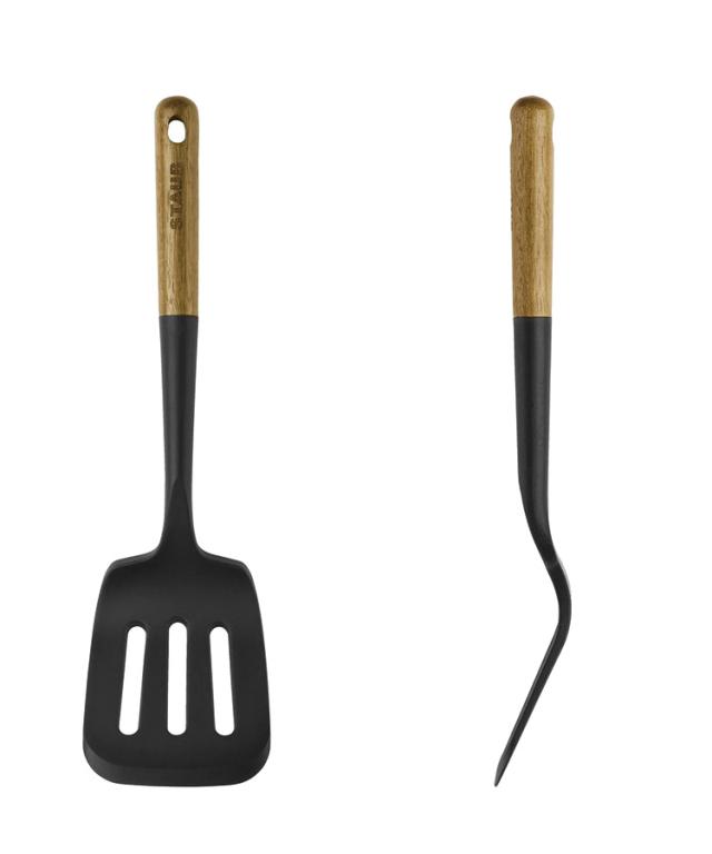 多彩な用途にかなう全11種を取り揃えました。ココットに優しいシリコンボディで、手になじむ天然木のハンドルに入ったシンプルなSTAUBロゴがワンポイント。フックにかけて壁に並べれば、キッチンの素敵なアクセントになります。ストウブでのお料理作りがはかどり、さらに楽しく