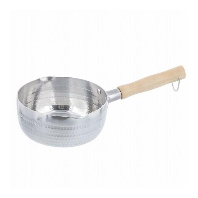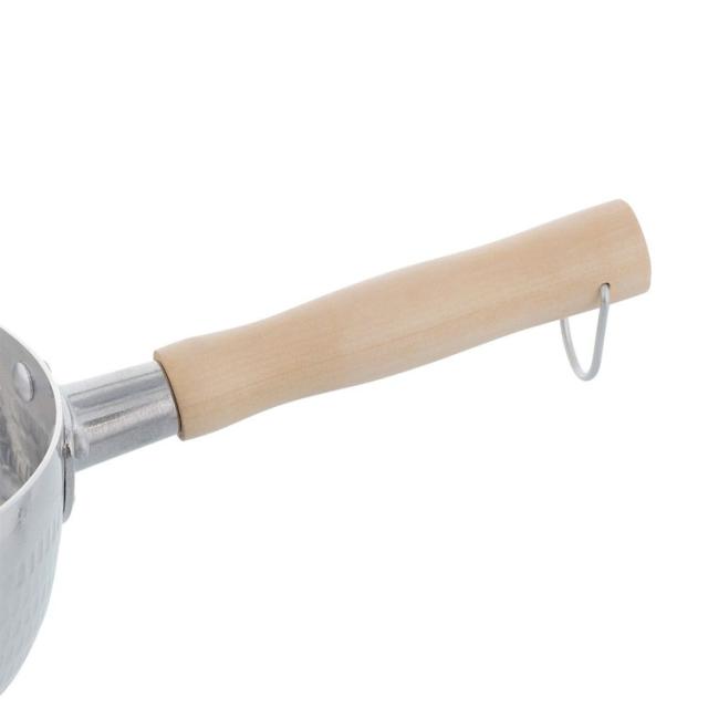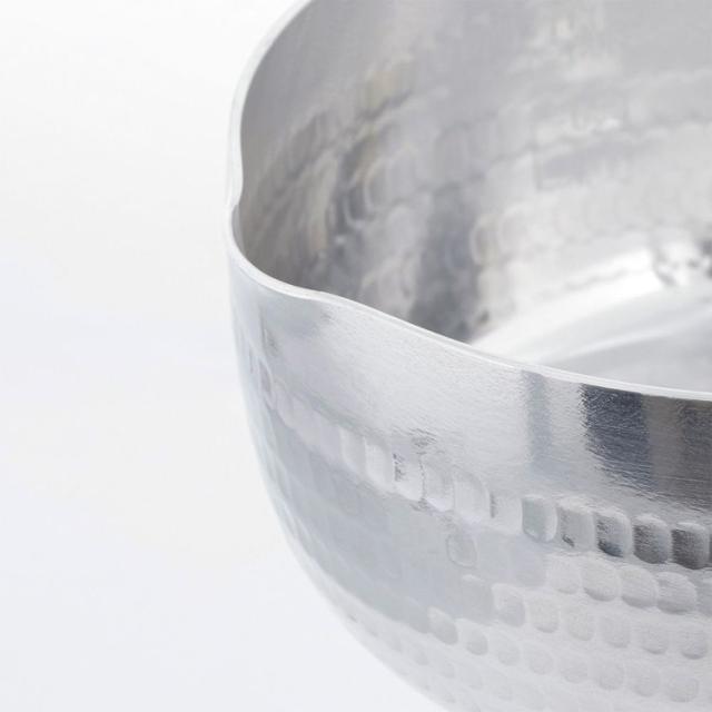 便利な分量目盛り付、両側注ぎ口付のガス火専用雪平鍋。内面には便利な分量目盛り付。汁物を注ぐときに便利な両側注ぎ口付。アルミ槌目加工で優れた強度。