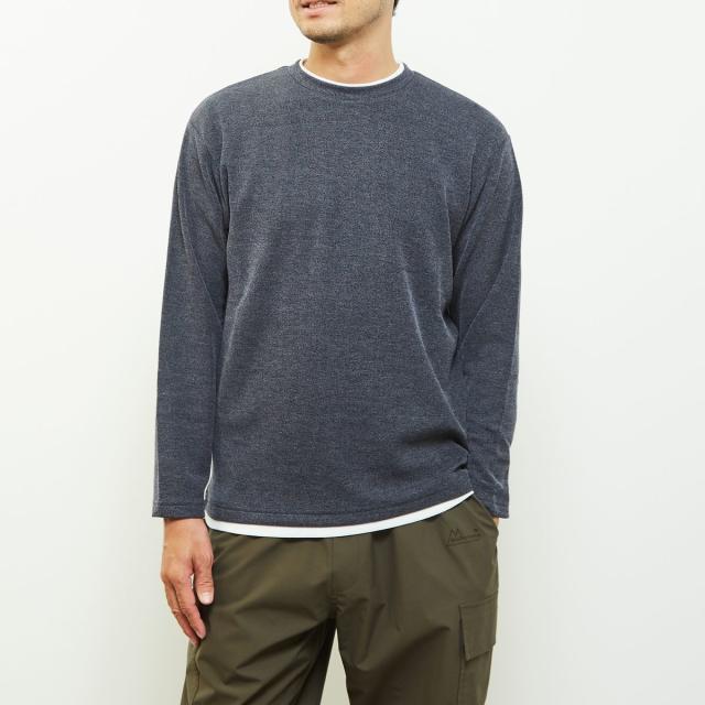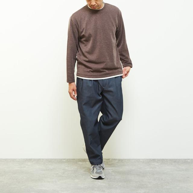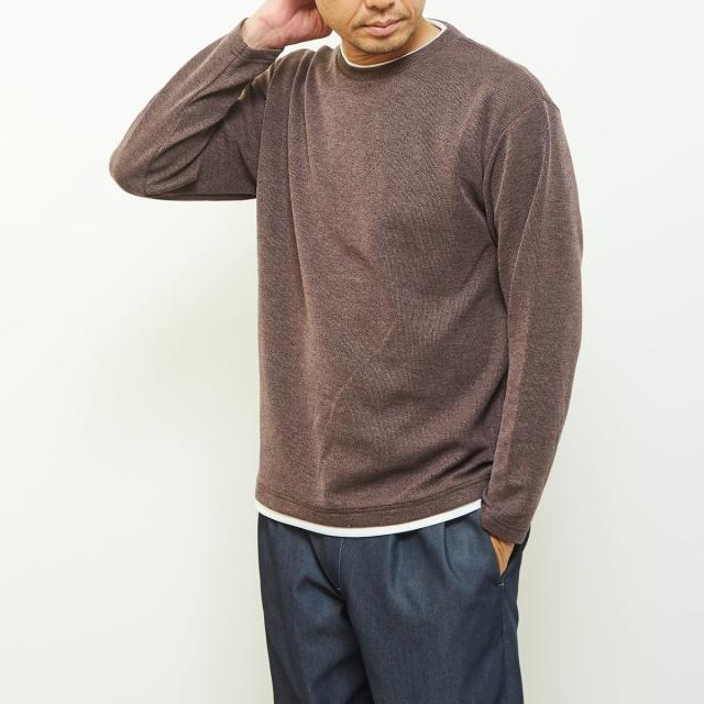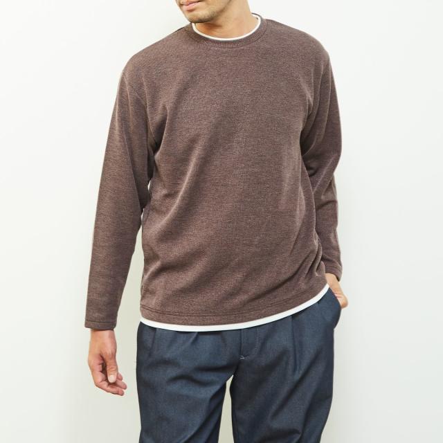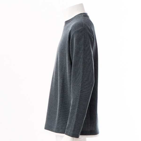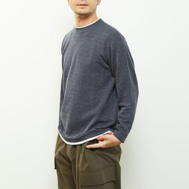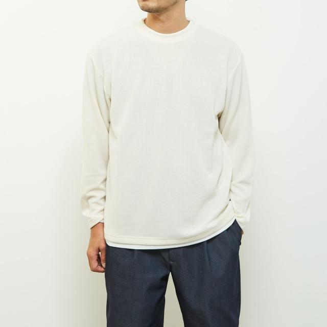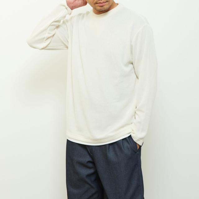 クルーネックの襟元に重ね着をしているようなフェイクレイヤードデザインなので、一着で奥行きのあるレイヤードが完成するためこなれた雰囲気を演出します。