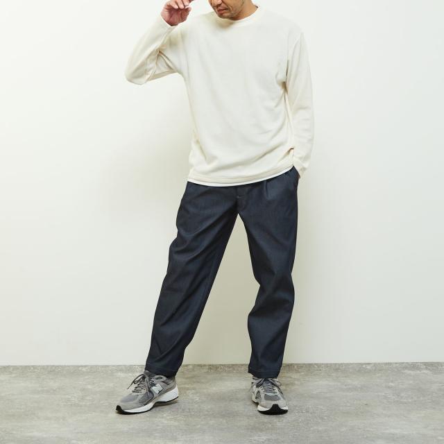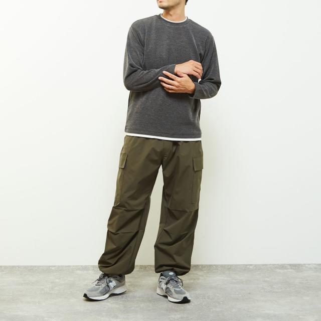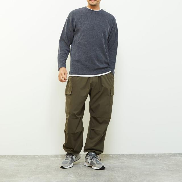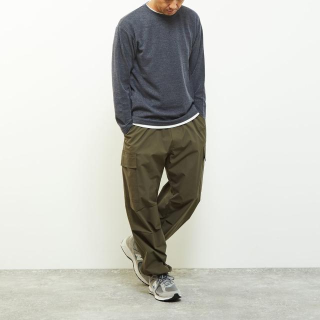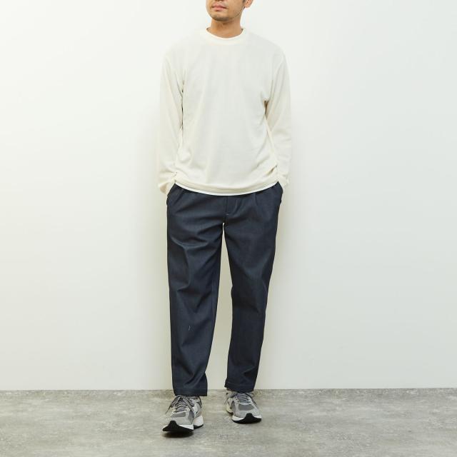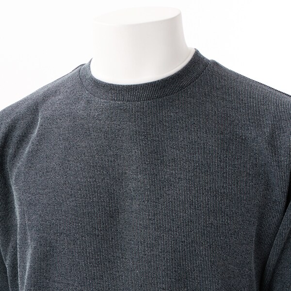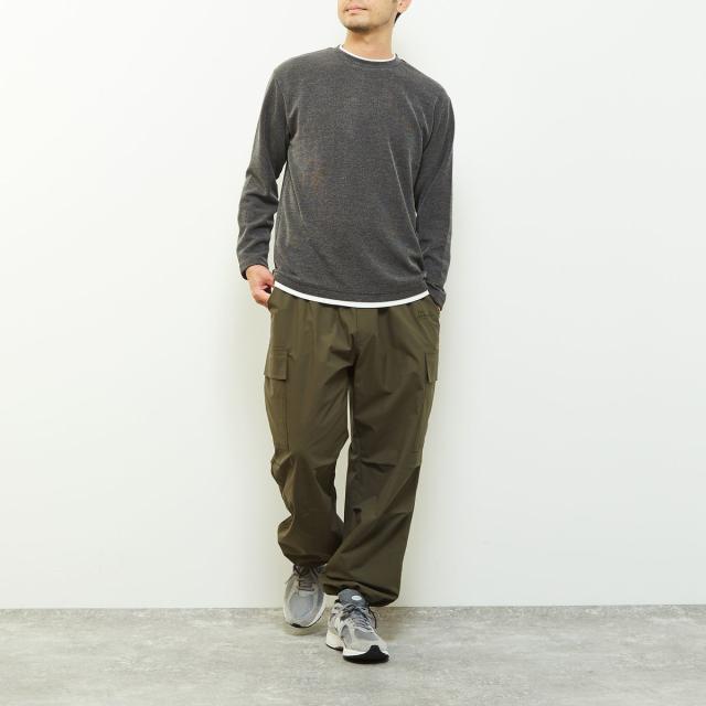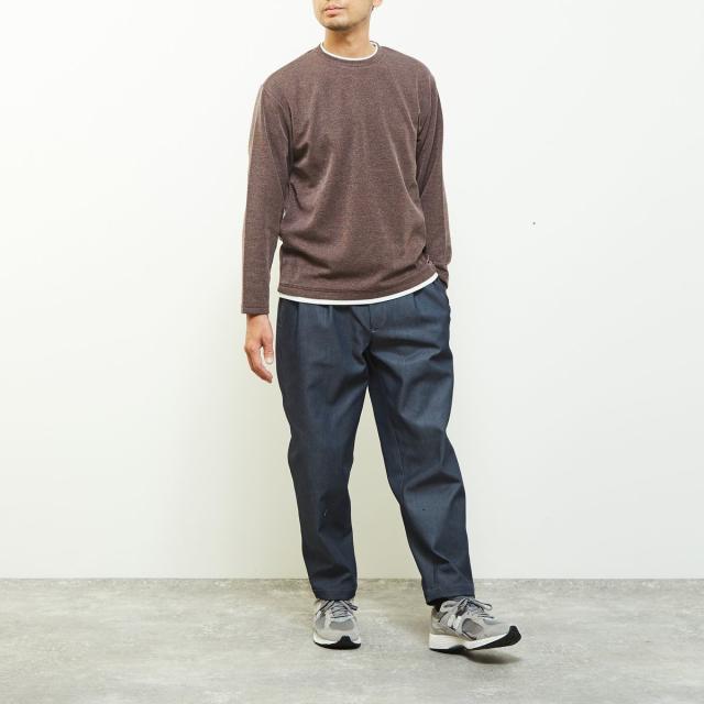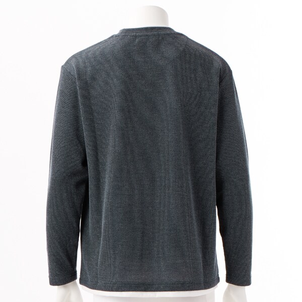 クルーネックの襟元に重ね着をしているようなフェイクレイヤードデザインなので、一着で奥行きのあるレイヤードが完成するためこなれた雰囲気を演出します。