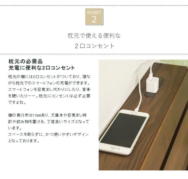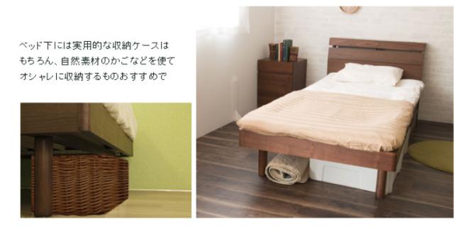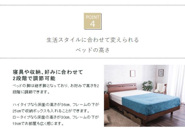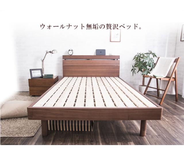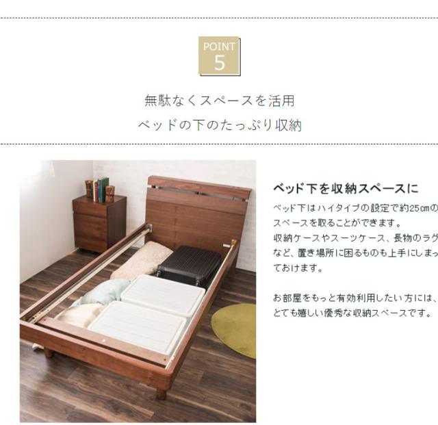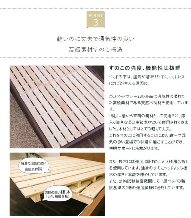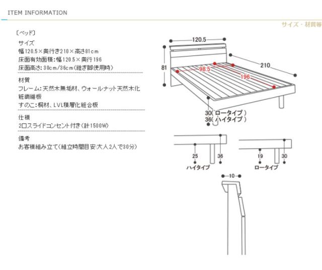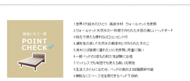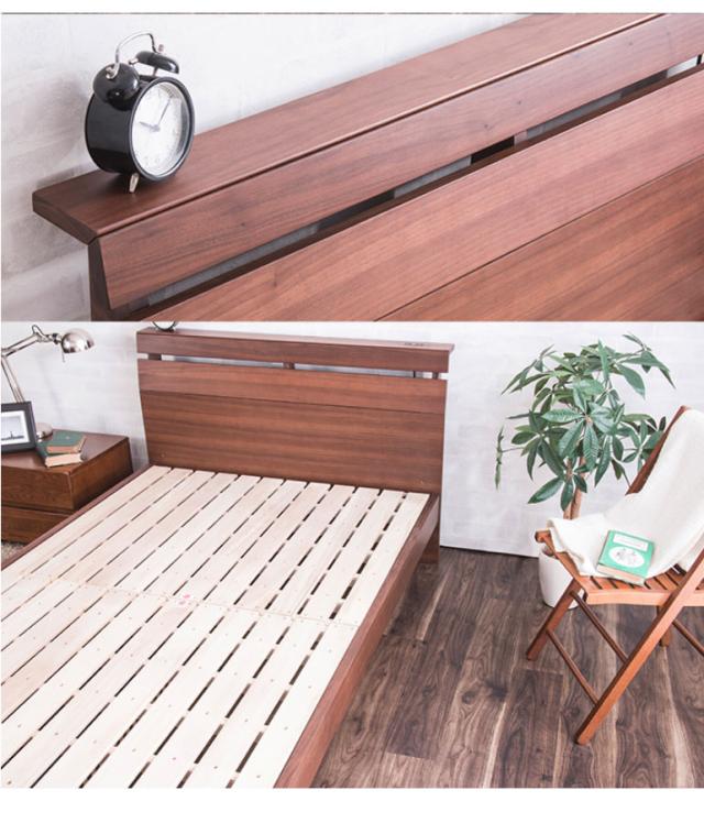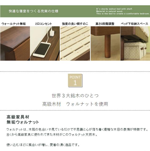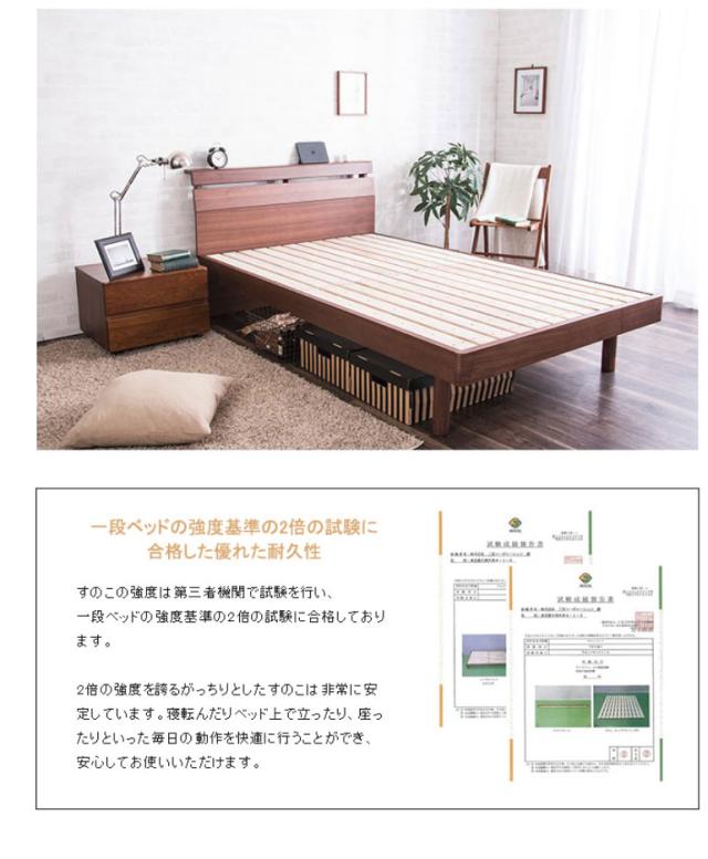 高級感のあるウォルナット材フレームの木製ベッドです。床面の高さが2段階で調節できる機能がついており、下部に荷物を置くことができる仕様です。ヘッドボードは高級感あふれるウォルナット材を使用し、棚やコンセントもついていますのでスマートフォンなどの充電も可能です。すのこは公的試験検査機関にて、一般ベッドの強度基準の2倍の強度試験に合格しており、お家にあるお布団でも安心して使用できます。また、通気性も良いのでマットレスがカビにくく、湿気の多い夏場でも安心してお使いいただけます。