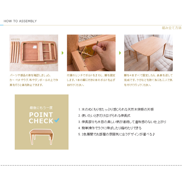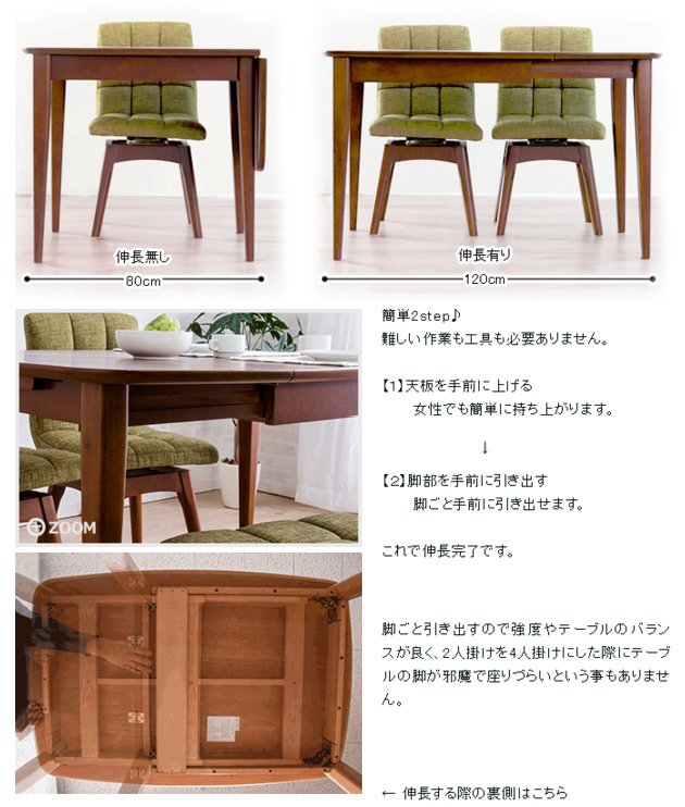 商品説明 天然木の木目が美しい伸長式ダイニングテーブル。