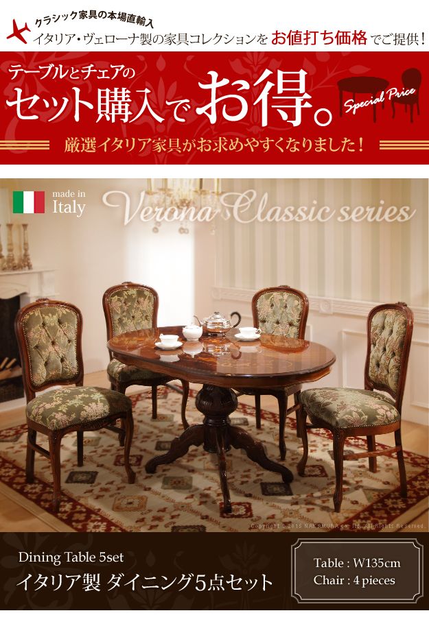 イタリア製 ヴェローナ クラシック ダイニング 5点セット 五点セット ダイニングテーブル 幅135 金華山 ダイニングチェア 四脚 おしゃれ(代引不可)【送料無料】