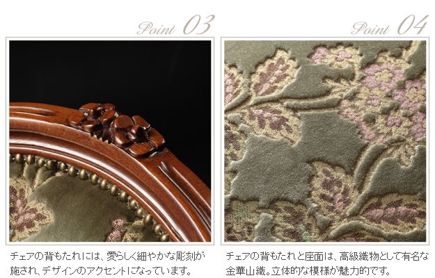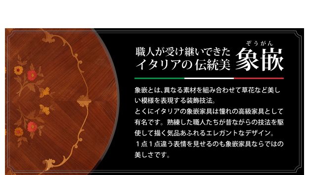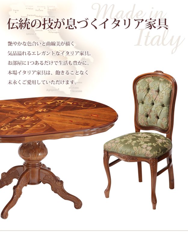 商品について:イタリア伝統の美しい象嵌細工が施された直輸入のダイニングテーブルセットです。艶やかな色合いと滑らかな曲線を描くフォルムがお部屋をエレガントに演出。チェアはフレームに施された彫刻と美しい猫脚が魅力的です。