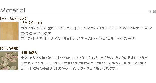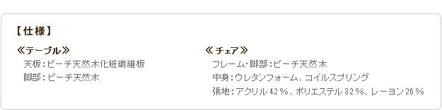 材質:[テーブル]天板-ビーチ天然木化粧繊維板、脚部-ビーチ天然木、[チェア]脚部・フレーム-ビーチ天然木、張り地-アクリル42%、ポリエステル32%、レーヨン26%、中身-ウレタンフォーム・コイルスプリング