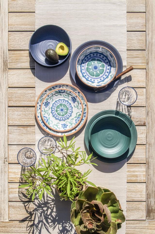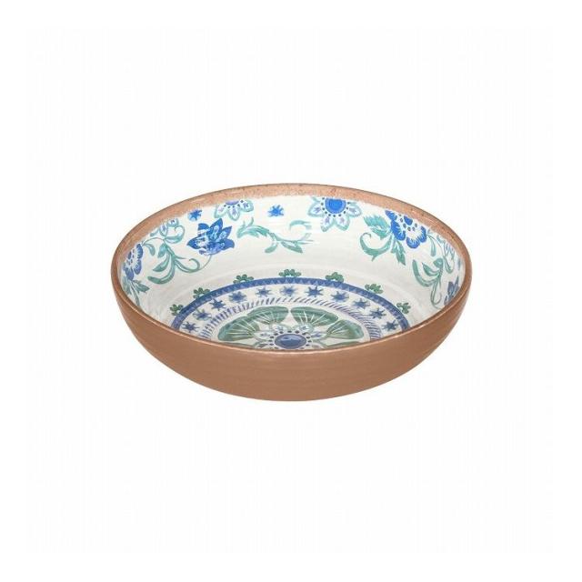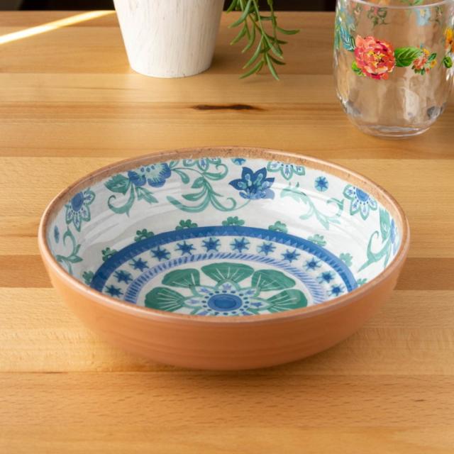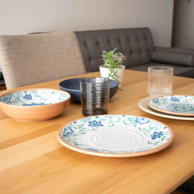 テラコッタ(素焼き)をモチーフ。手作りの風合いを模したブルーの花柄のメラミン食器です