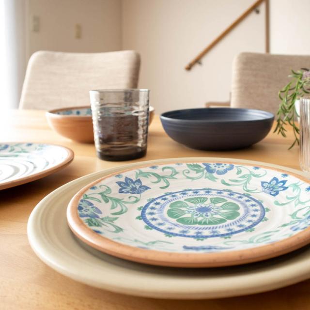 メラミン食器は「メラミン樹脂」というプラスチックを素材とした食器です。食器の日常使いに非常に適しており、軽くて丈夫、割れにくくて汚れが落としやすいです。メラミンは熱いものを入れても熱伝導率が低いので、熱々の料理を入れても食器自体が熱くなりにくく、持ちやすいです。また、他のプラスチック樹脂よりも硬度が高いため、食器に傷がつきにくく長く使用いただけます。