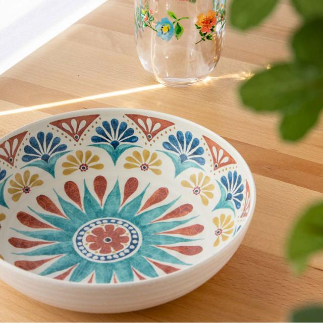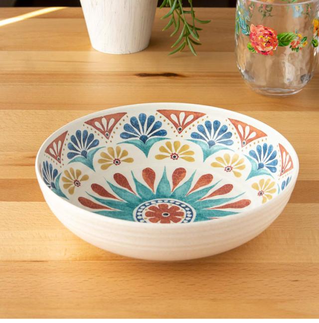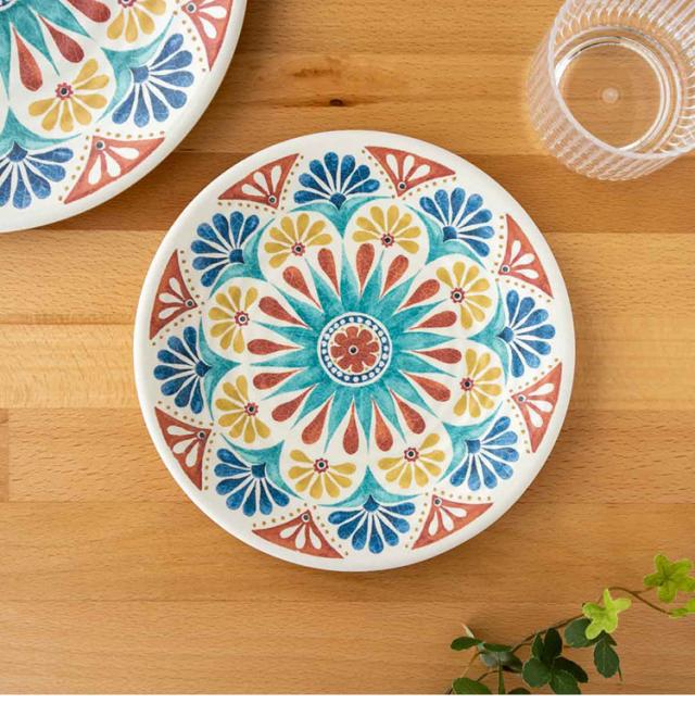 ハンドメイド風で南欧デザインが特徴のメラミン食器です。自然のモチーフをパッチワークのように組み合わせたユーモラスなデザインです
