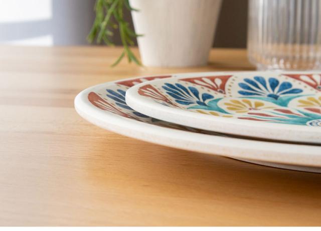 メラミン食器は「メラミン樹脂」というプラスチックを素材とした食器です。食器の日常使いに非常に適しており、軽くて丈夫、割れにくくて汚れが落としやすいです。メラミンは熱いものを入れても熱伝導率が低いので、熱々の料理を入れても食器自体が熱くなりにくく、持ちやすいです。また、他のプラスチック樹脂よりも硬度が高いため、食器に傷がつきにくく長く使用いただけます。