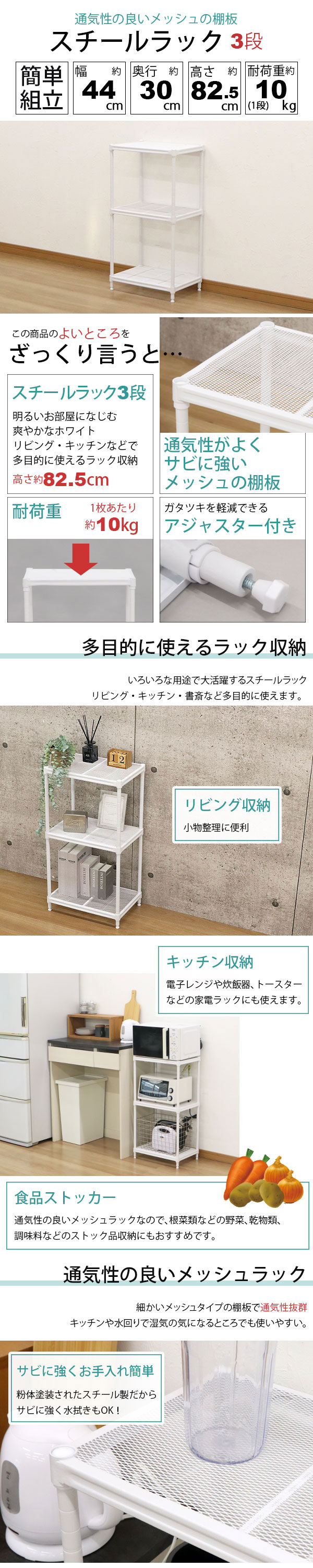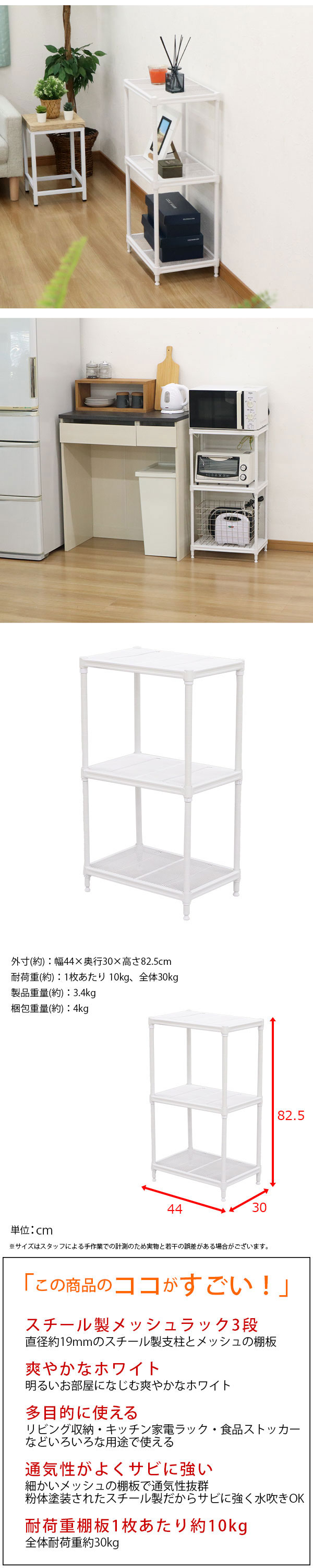 スチールラック 3段 45幅 メッシュ棚板 メッシュラック 収納 棚 ホワイト メッシュ 棚 白 おしゃれ 幅44cm 奥行30cm 高さ82.5cm 頑丈 丈夫 三段ラック オープンラック スリム キッチンラック レンジ台 洗剤収納 物が落ちにくい 倒れにくい 高さを変えられる棚 コンパクト