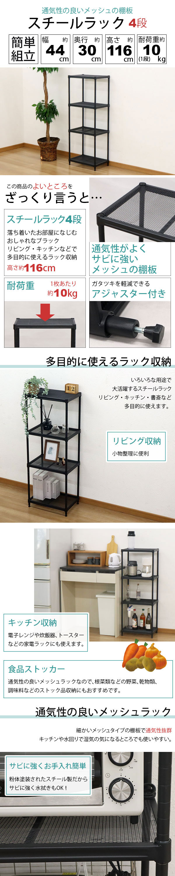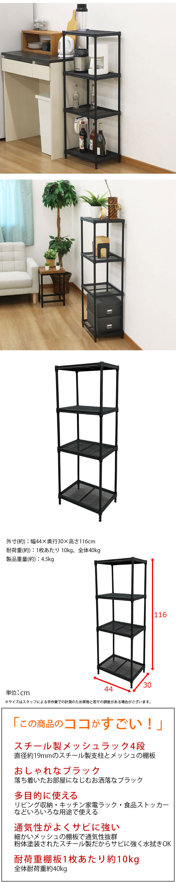 スチールラック 4段 45幅 メッシュ棚板 メッシュラック 収納 棚 ブラック メッシュ 棚 黒 おしゃれ 幅44cm 奥行30cm 高さ116cm 頑丈 丈夫 四段ラック オープンラック スリム キッチンラック レンジ台 洗剤収納 物が落ちにくい 倒れにくい 高さを変えられる棚 コンパクト
