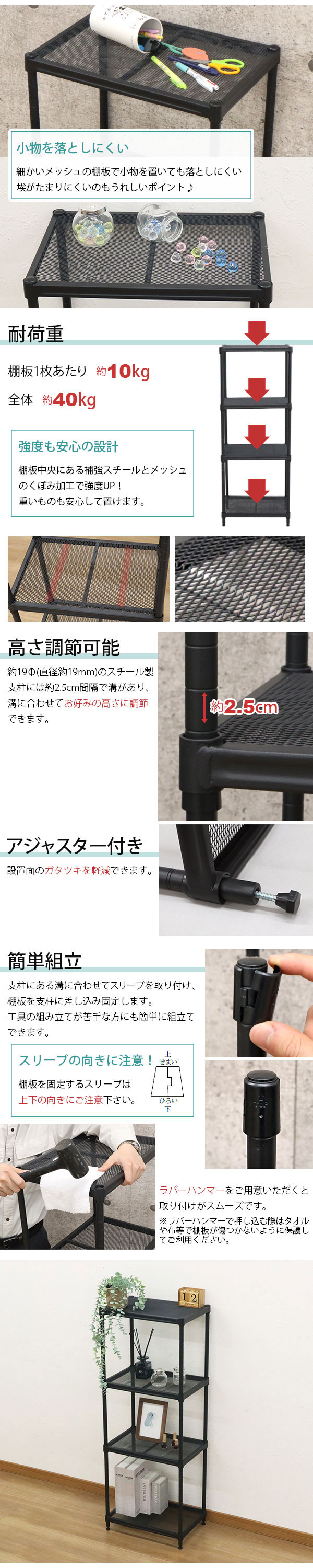 商品名:スチールラック 4段 45幅 メッシュ棚板 メッシュラック 収納 棚 ブラック メッシュ 棚 黒 おしゃれ 幅44cm 奥行30cm 高さ116cm 頑丈 丈夫 四段ラック オープンラック スリム キッチンラック レンジ台 洗剤収納 物が落ちにくい 倒れにくい 高さを変えられる棚 コンパクト 家具 インテリア 収納家具 棚 ラック 高さ調整 マルチラック フリーラック 多目的ラック 隙間収納 整理棚 オープン棚 オープンシェルフ キッチン収納棚 レンジラック 家電収納 キッチンストッカー 玄関ラック 玄関収納 ランドリーラック 洗剤 ストック プリンターラック プリンター台 本棚 ディスプレイラック 飾り棚 コレクションラック 小物収納 おもちゃ 雑貨 フラワースタンド 花台 プランターラック ランドセルラック サイドラック シンプル 新生活 一人暮らし ワンルーム キッチン 台所 リビング ダイニング 玄関 子供部屋 洗面所 脱衣所 クローゼット 押し入れ パントリー 納戸 すっきり 片付け 省スペース 組立簡単 可動棚 アジャスター付き ポール径19mm 黒い棚