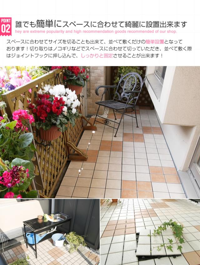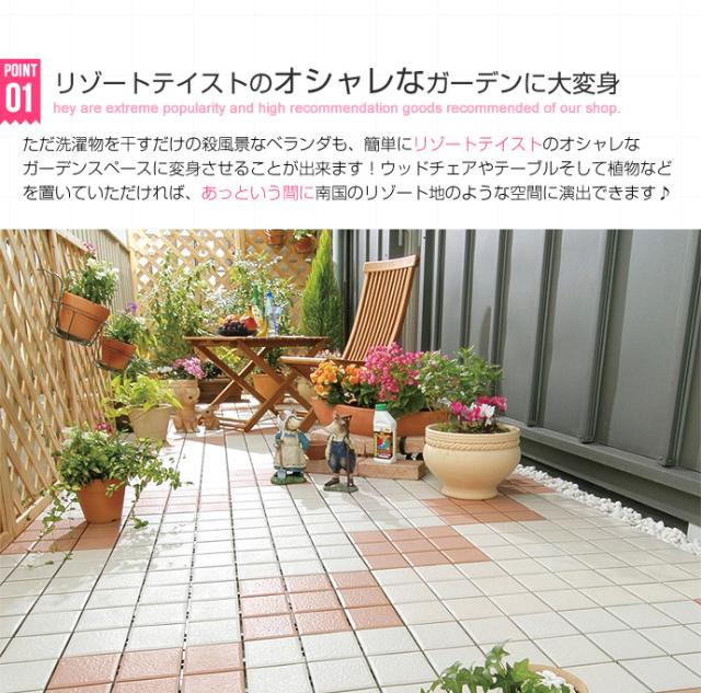 便利なジョイントパネル。ジョイント式だから、パズルのようにはめ込むだけで、誰でも簡単にベランダリフォームが可能です。殺風景なベランダも、ジョイントパネルで美しいタイル張りのセンスあるオープンエアに変身します。