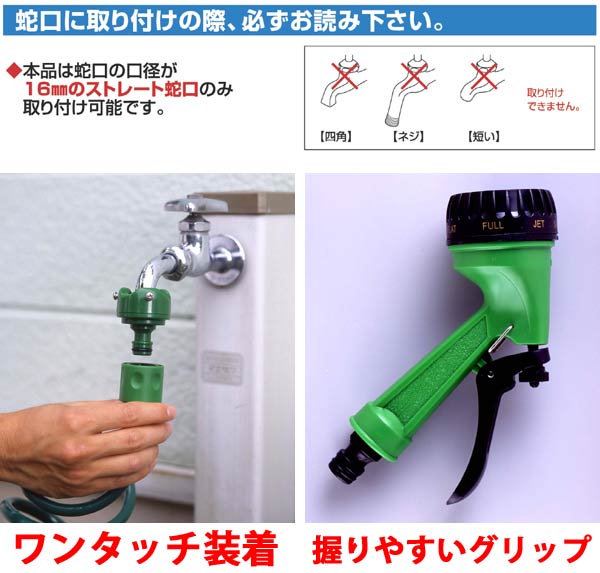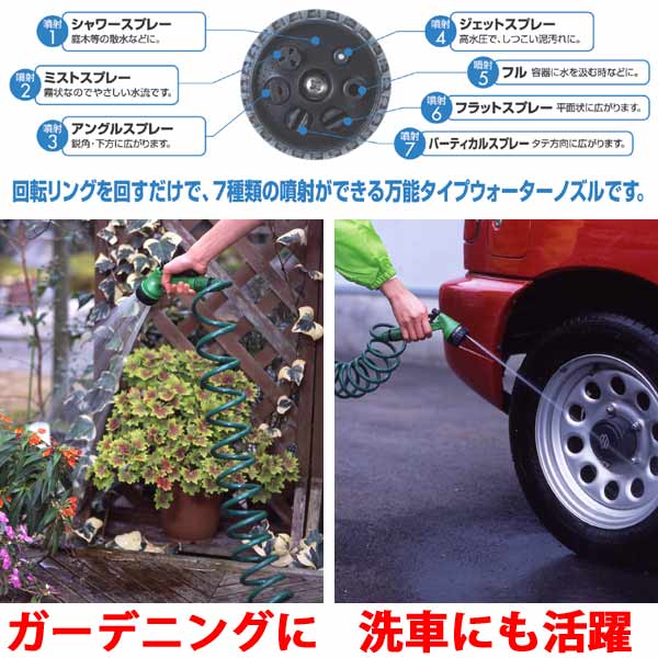 ■巻き取り不要、7種類の噴射ノズル付のガーデンホースです。