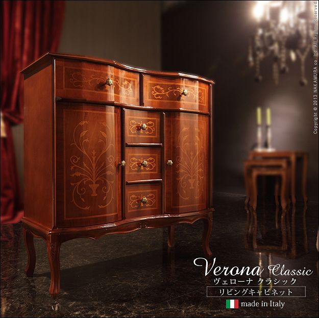 商品について:芸術作品ともいえるイタリア直輸入家具をご自宅に☆ヴェローナクラシックリビングキャビネット。艶やかな色合いと、滑らかな曲線を描くフォルムがお部屋をエレガントに演出します。彫刻が美しい猫脚も魅力的。引き出しの前板にはイタリア伝統の職人技である象嵌細工が施されています。