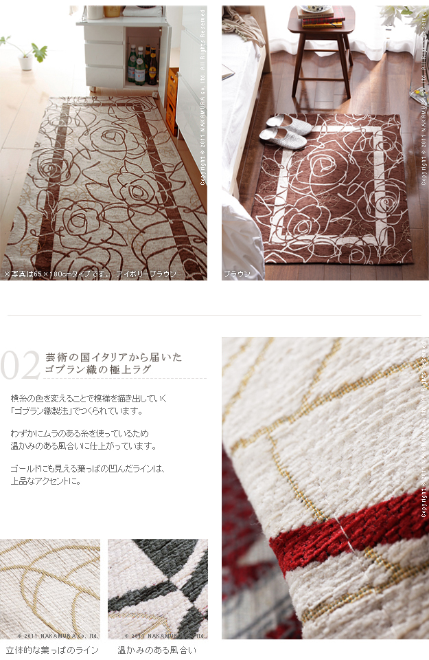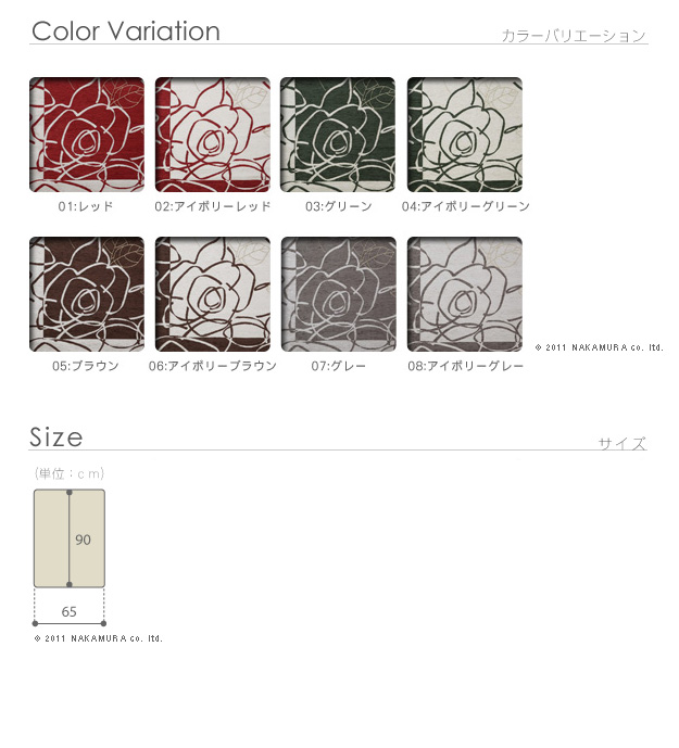 | 商品について | カメリアが描かれたゴブラン織の上品なやわらかいマット。織物らしいフラットな質感と短い毛足で一年中さらさら。全面滑り止め加工でお子様からお年寄りまで足元安心♪洗濯可。床暖房・ホットカーペット対応。 サイズ(cm):65x90・0.5kg カラー:全8バリエーション・画像2を参照 材質:アクリル40%・綿30%・ポリエステル30% 完成品 |