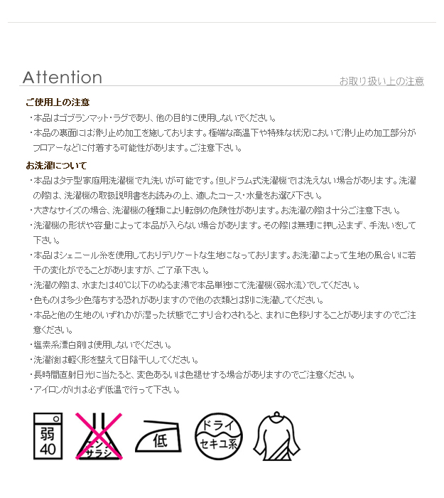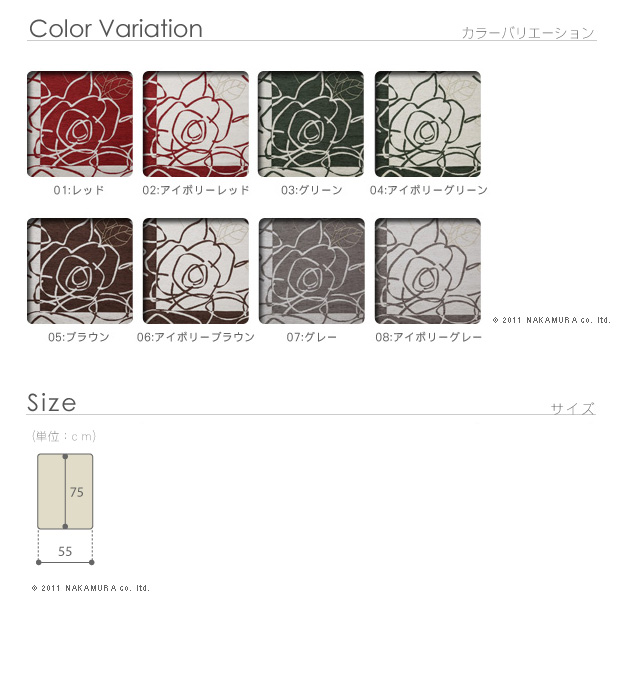 | 商品について | カメリアが描かれたゴブラン織の上品なやわらかいマット。織物らしいフラットな質感と短い毛足で一年中さらさら。全面滑り止め加工でお子様からお年寄りまで足元安心♪洗濯可。床暖房・ホットカーペット対応。 サイズ(cm):55x75・0.4kg カラー:全8バリエーション・画像2を参照 材質:アクリル40%・綿30%・ポリエステル30% 完成品 |