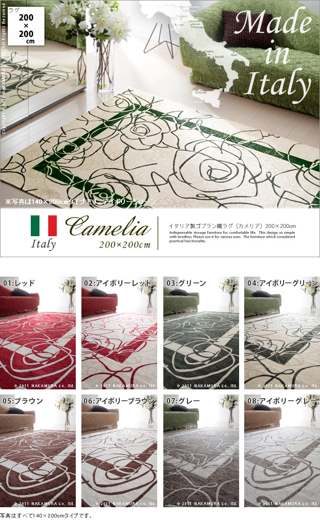 イタリア製 コブラン織り ラグ Camelia カメリア 200×200 四角形 ラグマット 床暖房対応 ホットカーペット対応 おしゃれ 北欧 洗える(代引不可)【送料無料】
