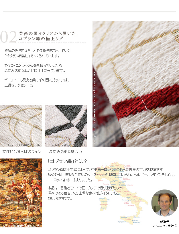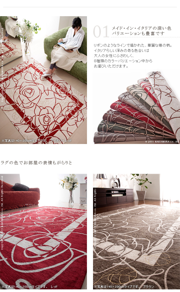 | 商品について | カメリアが描かれたゴブラン織の上品なやわらかいラグ。全面滑り止め加工でお子様からお年寄りまで足元安心♪洗濯可。床暖房・ホットカーペット対応。 サイズ(cm):200x200・2.4kg カラー:全8バリエーション・画像2を参照 材質:アクリル40%・綿30%・ポリエステル30% 完成品 |