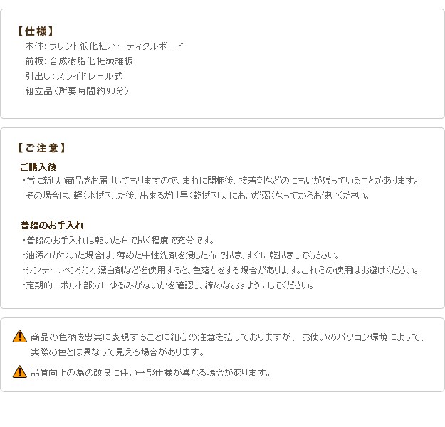 材質:本体-プリント紙化粧パーティクルボード、木口-PVC貼り、前板-合成樹脂化粧繊維板