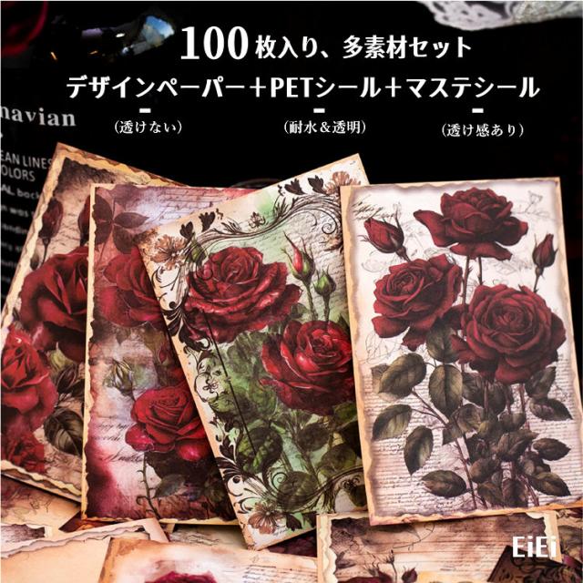100枚 多素材 詰め合わせセット PET 耐水 シール マステシール デザインペーパー コラージュ素材 大容量 おしゃれ ローズ 薔薇 人物シール 外国女性 女の子 女子 レース フレーム 枠 透明シール 背景紙 花柄 花束 アンティーク レトロ コラージュ 素材 赤 青 DIY