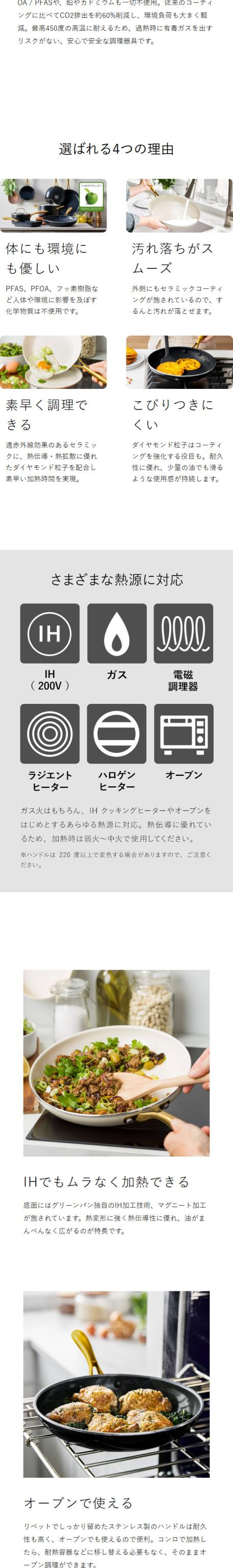 ゴールドのハンドルが華やかな「 GREENPAN ストゥディオ」。ハンドルは熱くなりにくく軽量。こびりつきにくく汚れ落ちが良いセラミックコーティングでガス火やIH、オーブン、食洗機OK。