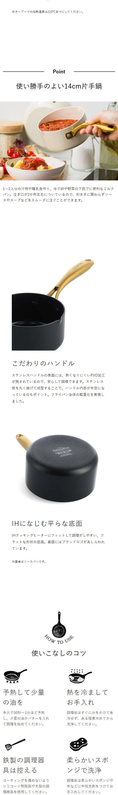 離乳食や揚げ物もおまかせ セラミックのミルクパン 世界に先駆けてフッ素樹脂不使用のノンスティック調理器具を開発した、ベルギーの人気ブランド「 GREENPAN 」の『 ストゥディオ ミルクパン 14cm 』。華やかなゴールドのステンレスハンドルがスタイリッシュな片手鍋です。ハンドル表面には熱くなりにくいPVD加工が施され、内部を中空にすることで軽量化も実現。鍋の内側と外側には、こびりつきにくく汚れ落ちが良いセラミックコーティングも。ガス火やIH、オーブンOK。食洗機対応です。