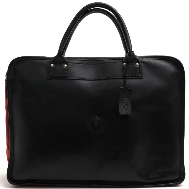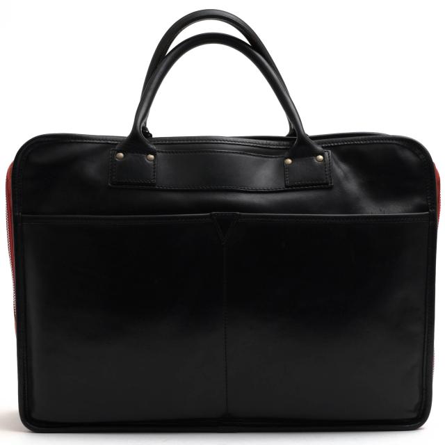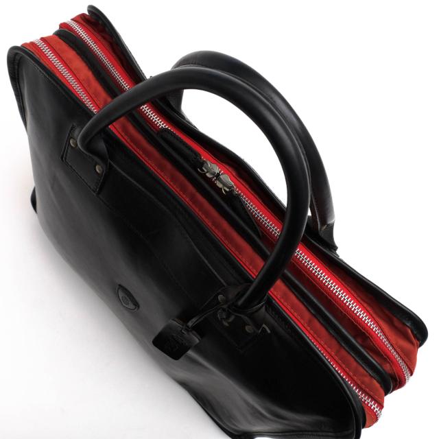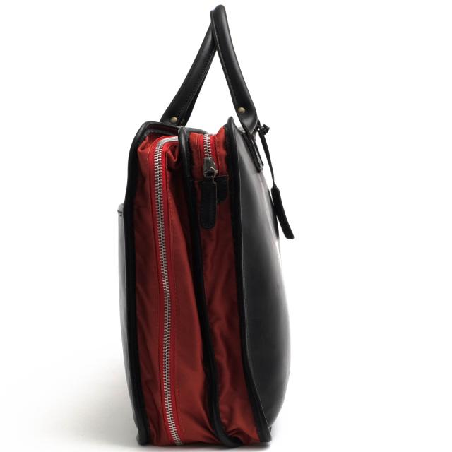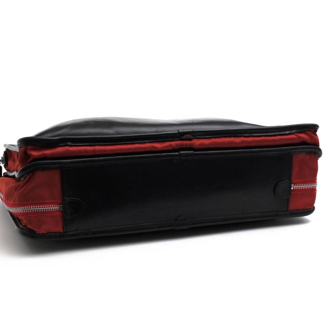 A4サイズがおさまるコンパクトな2室構造のブリーフケース。定番のリモンタナイロンは側面に、あえてバケッタレザーを前面に使用したラグジュアリーな仕様。背面側はダブルファスナー仕様で底部まで大きく開閉できるので、荷物の出し入れも楽に行えます。手前のファスナーを開けると内側は、ステッチで仕切られたポケットが2つとファスナーポケットが1つ、本体背面にはアウトポケットが1つ付いています。小物や書類の収納に便利なポケットが随所に装備されているので、すっきり収納できます。