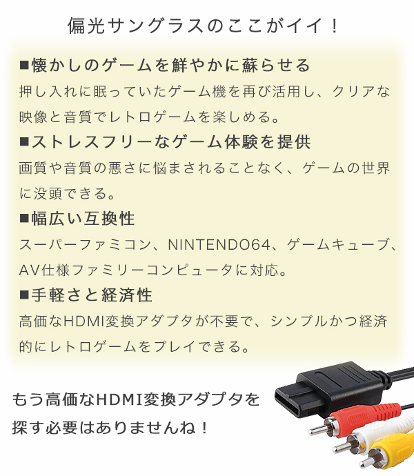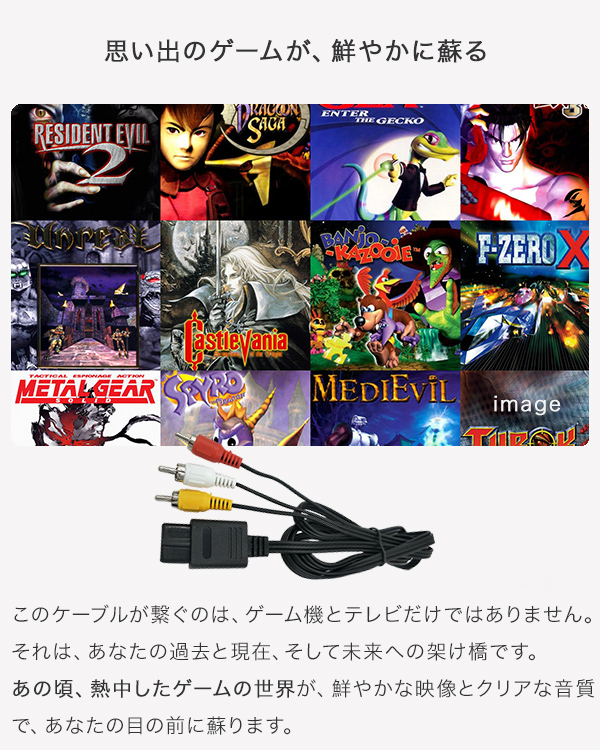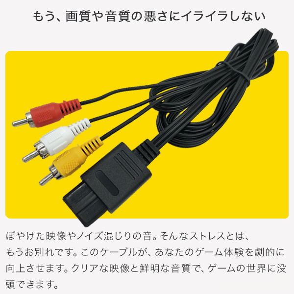 懐かしのゲームの世界へ、時を超えて繋がる魔法のケーブル \ステレオ AVケーブルのここがイイ!!/ ■懐かしのゲームを鮮やかに蘇らせる: 押し入れに眠っていたゲーム機を再び活用し、クリアな映像と音質でレトロゲームを楽しめる。 ■ストレスフリーなゲーム体験を提供: 画質や音質の悪さに悩まされることなく、ゲームの世界に没頭できる。 ■幅広い互換性: スーパーファミコン、NINTENDO64、ゲームキューブ、AV仕様ファミリーコンピュータに対応。 ■手軽さと経済性: 高価なHDMI変換アダプタが不要で、シンプルかつ経済的にレトロゲームをプレイできる。 【もう高価なHDMI変換アダプタを探す必要はありませんね!】 1. 思い出のゲームが、鮮やかに蘇る このケーブルが繋ぐのは、ゲーム機とテレビだけではありません。 それは、あなたの過去と現在、そして未来への架け橋です。あの頃、 熱中したゲームの世界が、鮮やかな映像とクリアな音質で、あなたの目の前に蘇ります。 ・子供の頃の興奮を、もう一度 ・押し入れのゲーム機が、再び主役になる ・家族や友人との、楽しい時間の始まり 2. 埃をかぶっていたゲーム機が、リビングの主役になる もう、あの頃の感動は過去のものだと諦めていませんか? このケーブルがあれば、そんなことはありません。 レトロゲームの価値が再発見され、あなたのリビングが、家族や友人と楽しめるエンターテイメント空間に変わります。 ・ゲーム機を探すワクワク感 ・ゲームを始める前の高揚感 ・みんなで楽しむ笑顔 3. もう、画質や音質の悪さにイライラしない ぼやけた映像やノイズ混じりの音。そんなストレスとは、もうお別れです。 このケーブルが、あなたのゲーム体験を劇的に向上させます。クリアな映像と鮮明な音質で、ゲームの世界に没頭できます。 ・ゲームの面白さを最大限に引き出す ・ストレスフリーなゲーム体験 ・ゲームへの集中力アップ 4. 互換性への不安は、もう必要ありません このケーブルは、スーパーファミコン、NINTENDO64、ゲームキューブ、AV仕様ファミリーコンピュータに対応しています。 もう、ケーブルの互換性について心配する必要はありません。安心して、ゲームの世界に飛び込んでください。 ・対応機種の多さ ・安心してゲームを楽しめる ・ゲーム選びの自由 5. もう、高価なHDMI変換アダプタを探す必要はありません このケーブルがあれば、もう高価なHDMI変換アダプタを探す必要はありません。 シンプルに、お手軽に、レトロゲームの世界を楽しむことができます。 ・余計な出費を抑える ・すぐにゲームを始められる ・ゲーム体験へのスムーズな導入 この魔法のケーブルを手に取り、あの頃の感動を再び体験してください。 あなただけのゲームの世界が、鮮やかに広がります。 サイズ:長さ約1.8m 重さ:約60g 素材:プラスチック、銅線 【注意事項】 ※本商品には説明書が付属しておりません。使用方法に関しては商品ページをご参照ください。 ※商品画像はご覧になっているモニターやPCなどの環境、解像度により、実物と多少カラーが異なる場合がございます。色味やサイズが異なるなどのクレームはご対応致しかねますので、予めご了承ください。 ※輸送中に外装に傷やへこみが起こる場合がございますが、商品に影響はございませんので、予めご了承のもとお買い求めください。 ※本商品は海外からの輸入品ですので、細かい傷や汚れなどある場合がございます。予めご了承のもとお買い求めください。 ※こちらの商品は安価にご提供するため、簡易包装、簡易パッケージとなっております。 ※本商品を使用した事による、直接もしくは間接的に生じた損害、データの破損、怪我について当店は一切の責任を負いません。 ※本体や付属品が水に濡れると故障の原因となりますので、汚れた場合はウェットティッシュや濡れタオルを使って汚れを拭き取ってください。 ※本商品は長いケーブルになります。お子様の首や手首などに巻き付き、事故、怪我の原因となりますので、お子様の手の届かない場所で保管してください。 ※本商品はすべての環境、機器との接続を保証するものではございません。一部の機器では環境、相性等により接続できない場合がございます。予めご了承ください。 |