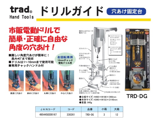 難しい角度穴あけが簡単に。最大45°まで設定。ドリルは1〜10mmまで使用可能。専用チャックハンドル付。