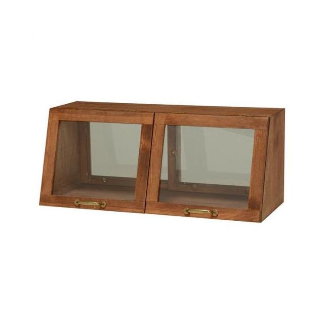 木の風合いが味わい深いカウンター上ガラスケース。表と裏で違う表情を見せる形状でディスプレイとしても活躍します。