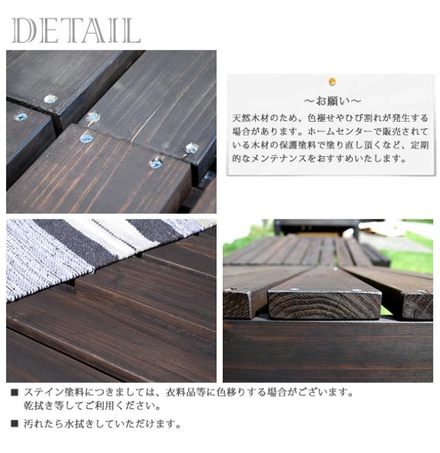 | ■備考 | ※汚れたら水拭きしていただけます。 ※天然木のため、色褪せやひび割れが発生する場合があります。ホームセンターで販売されている木材の保護塗料で塗り直しいただくなど、定期的なメンテナンスをおすすめいたします。 ※ステイン塗料につきましては、衣料品等に色移りする場合がございます。乾拭きなどしてご利用ください。 |