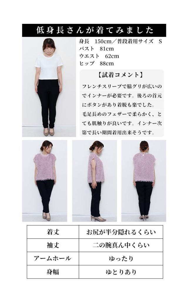 着丈はおしりが半分隠れるくらいです。フレンチスリーブで脇グリは広く中が見えるのでインナーが必要です。後ろの首元にボタンがあり着脱も楽でした。毛足長めのフェザーで柔らかく、とても肌触りが良かったです。インナー次第で長い期間着用出来そうです。
