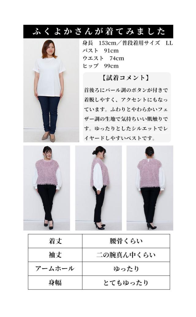 着丈はおへそと脚の付け根の間でした。ボリューミーなシャギーフェザーでふんわり感が可愛いベストです。肩をカバーするフレンチスリーブです。ゆったりしたシルエットで、ラウンドネック、後ろボタン1つ留めです。