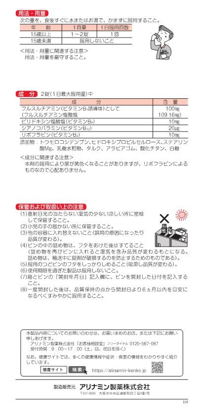 2錠中 成分:分量:内訳 フルスルチアミン:100mg:(フルスルチアミン塩酸塩109.16mg) ピリドキシン塩酸塩:10mg: シアノコバラミン:20μg: リボフラビン:10mg:
